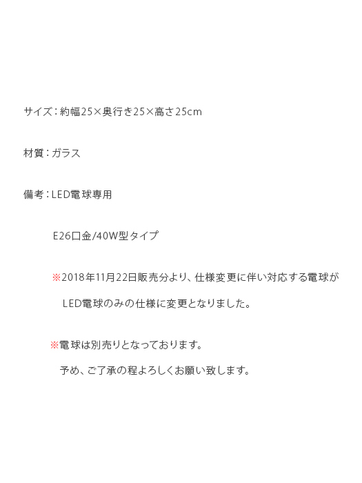 サイズ:約幅25×奥行き25×高さ25cm 材質:ガラス 備考:LED電球専用E26口金/40W型タイプ※2018年11月22日販売分より、仕様変更に伴い対応する電球がLED電球のみの仕様に変更となりました。
